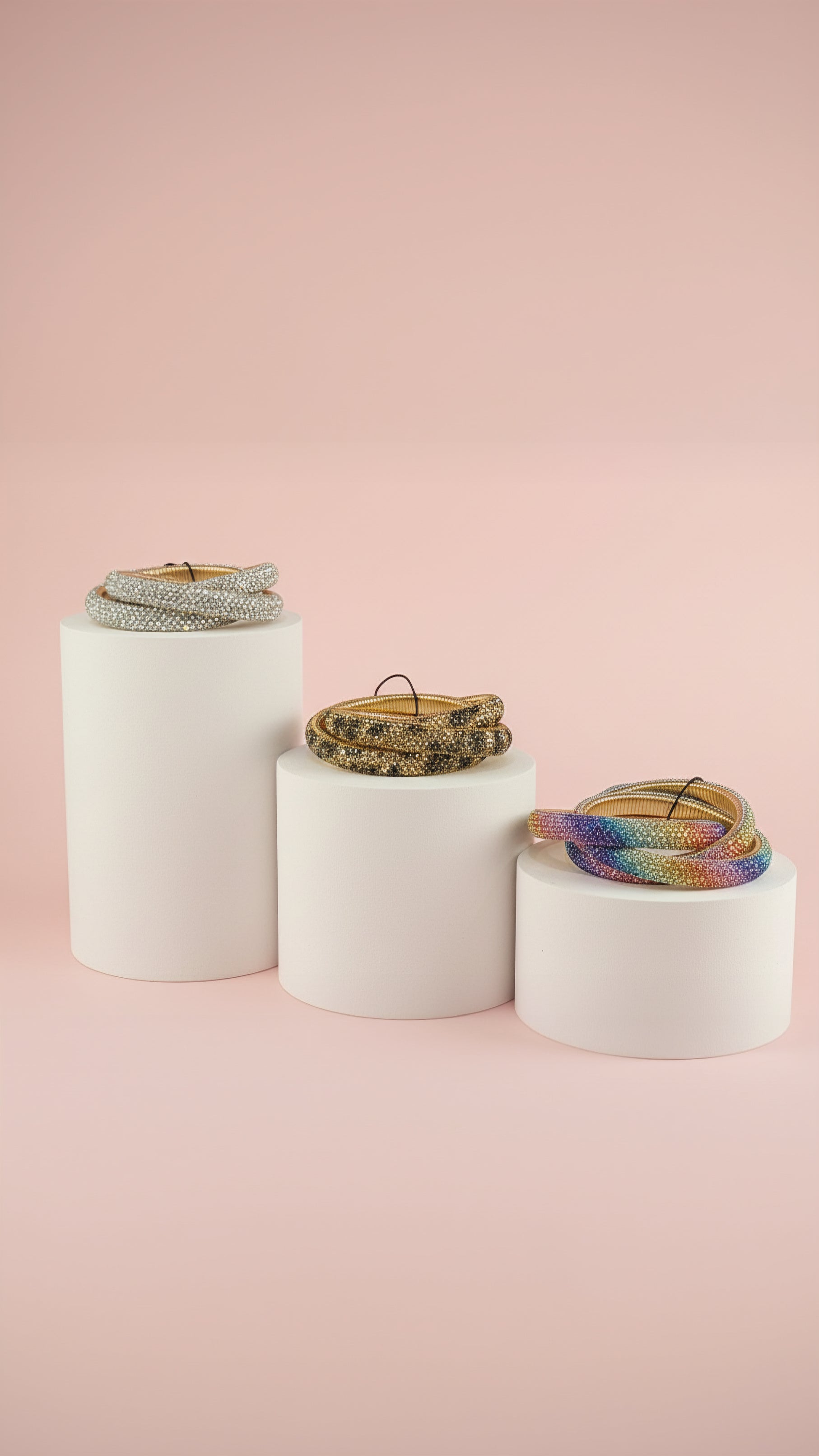 Add a touch of cuteness and prettiness to your outfit with our Interlocking Triple Stretchy Bangles. These stylish bangles are perfect for any occasion and are designed to interlock, providing a secure and comfortable fit. With their easy stretch design, they are sure to become a staple in your jewelry collection.