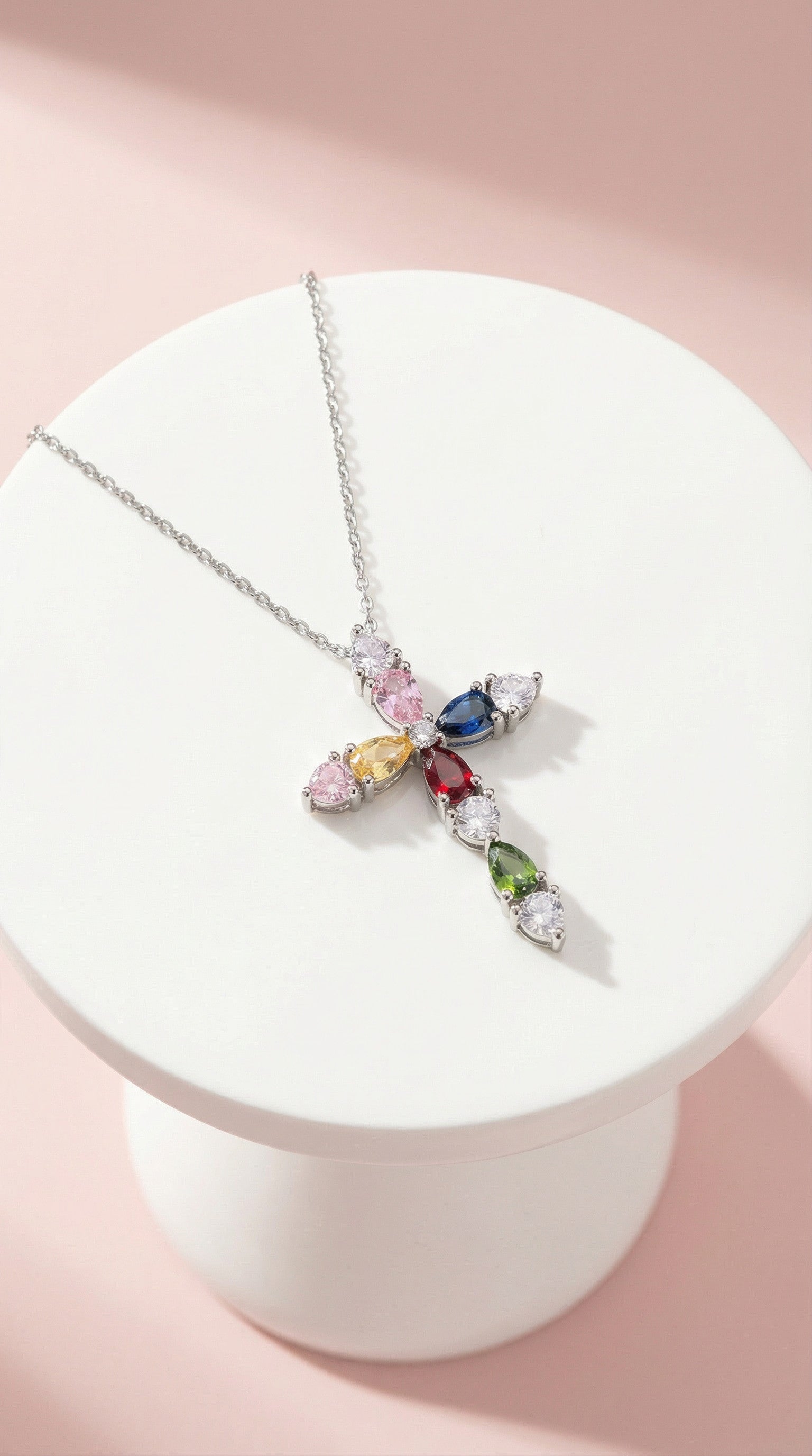 Oval Rainbow Crystal Cross Stainless Steel Necklace