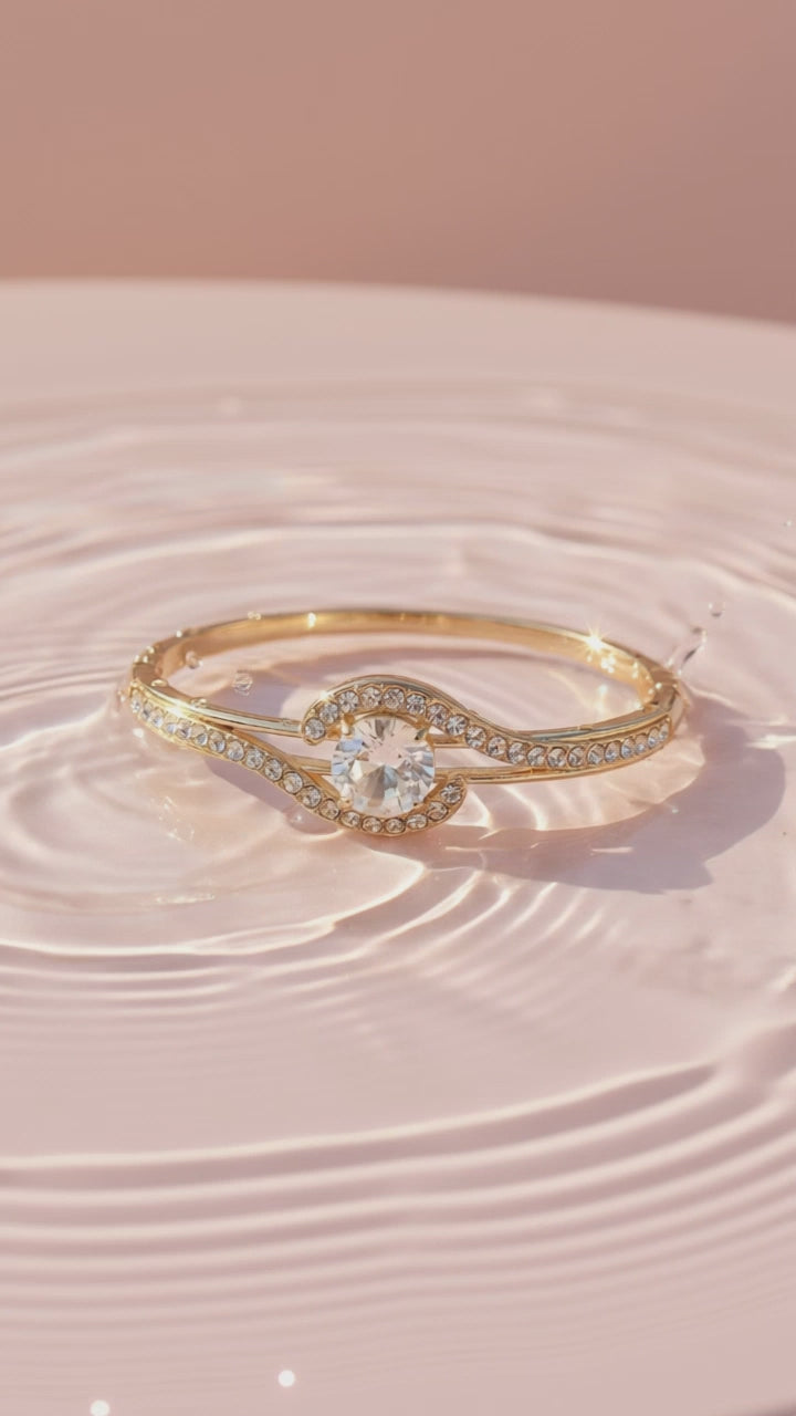 Round Solitaire Pave Crystal Inlaid Stainless Steel Gold Plated Hinged Bangle