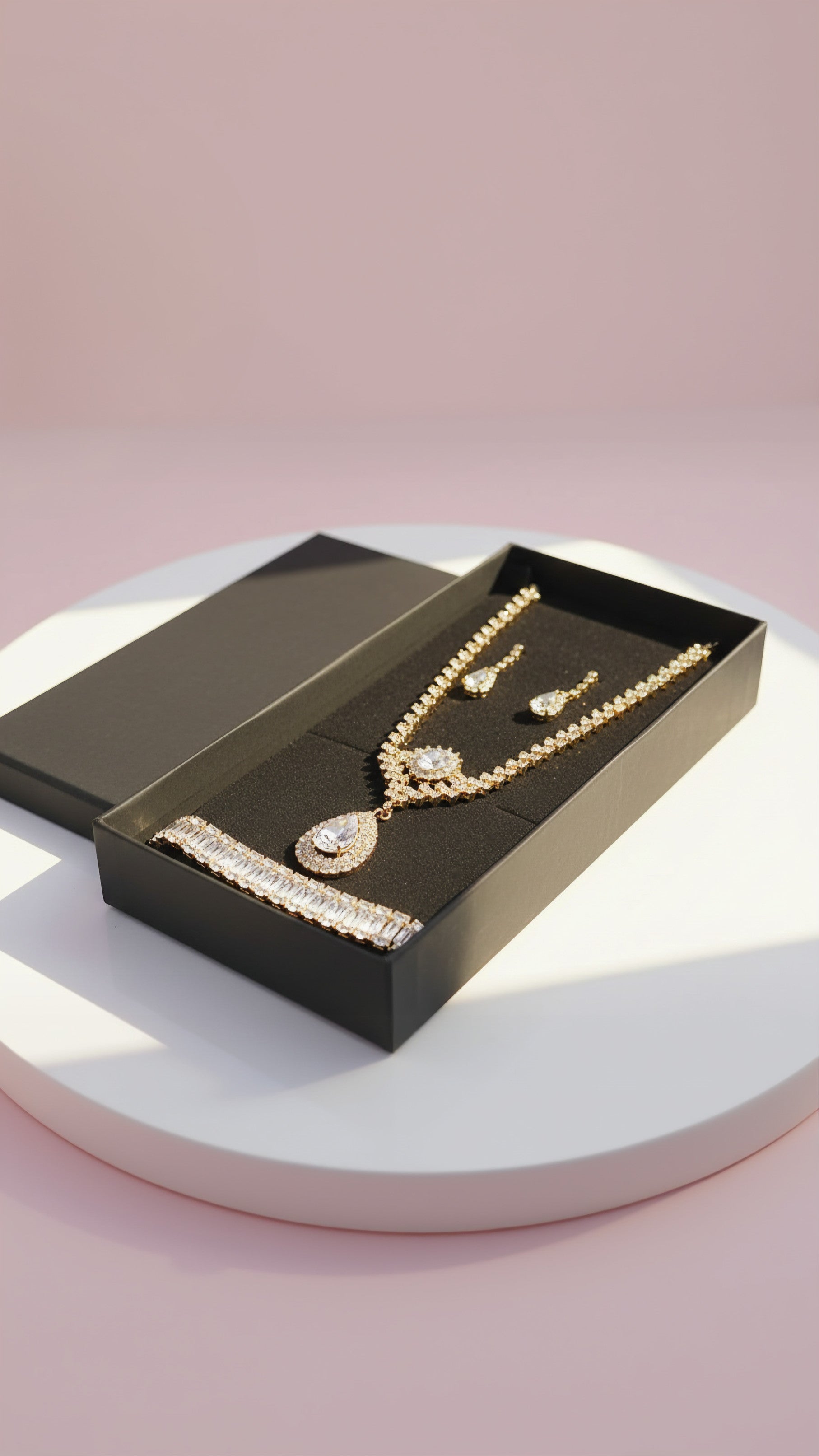This stunning 5-piece collection includes a matching necklace, statement earrings, adjustable ring, and elegant bracelet – all beautifully presented in a premium black gift box. Crafted with high-quality crystal stones and a reflective leaf-inspired design, this set delivers maximum sparkle from every angle.
