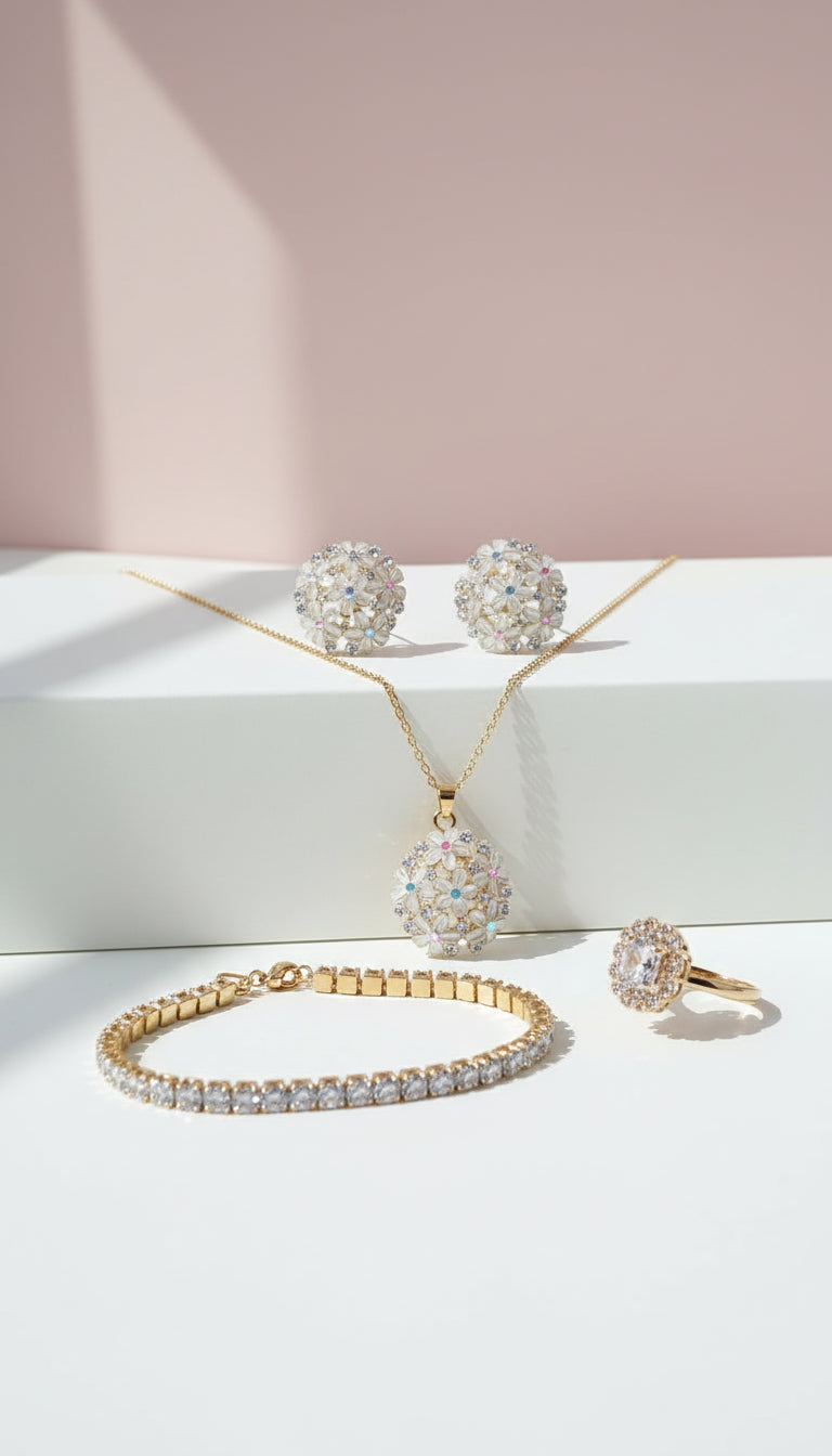This stunning 5-piece collection includes a matching necklace, statement earrings, adjustable ring, and elegant bracelet – all beautifully presented in a premium black gift box. Crafted with high-quality crystal stones and a reflective -inspired design, this set delivers maximum sparkle from every angle.